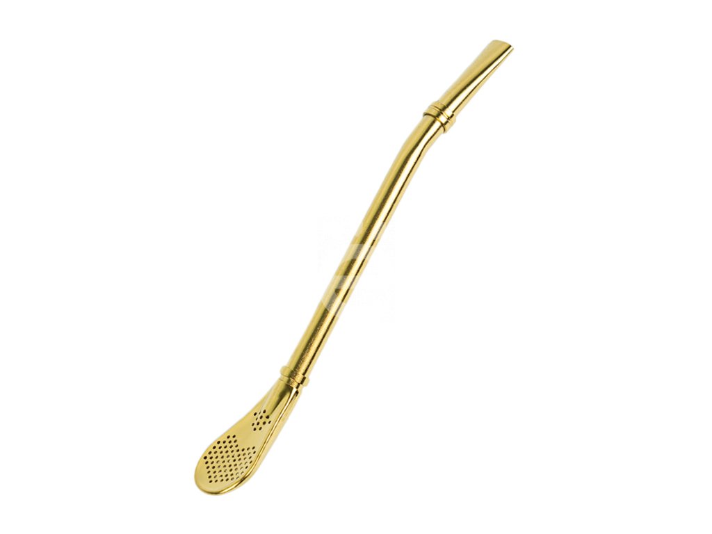 Jednoduchá nerezová bombilla zlaté barvy, délka 15,5 cm, průměr lžičky 2 cm, zdobená jednoduchým chladičem.