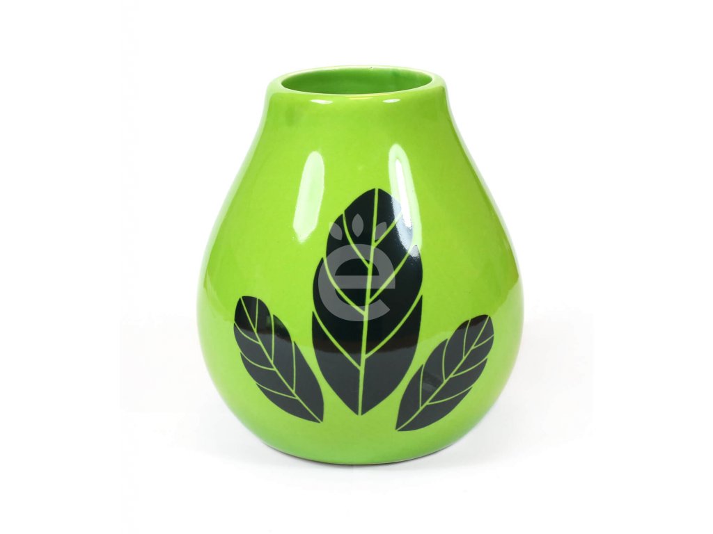 Keramická kalabasa s motivem tří lístků. Výhodou keramických kalabas je jejich praktičnost a snadná hygienická údržba, neplesniví.