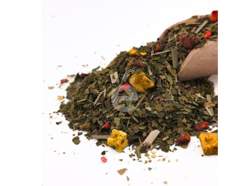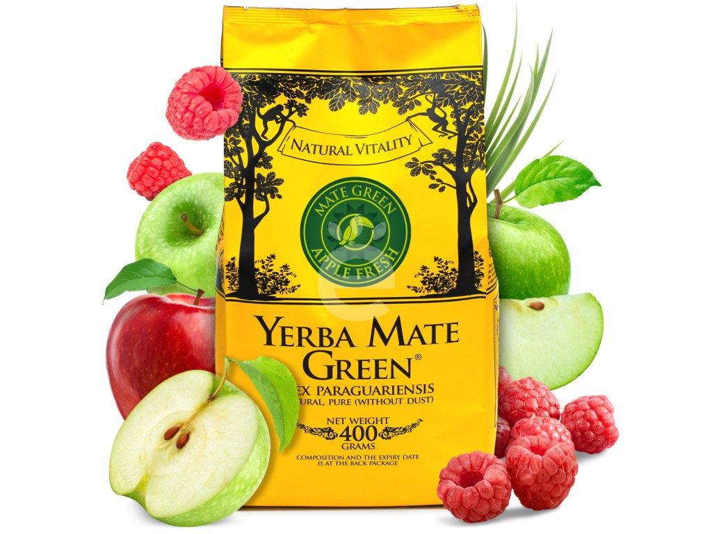 - Složení: Yerba maté (Ilex paraguariensis) 88 % – zelené listy bez stonků a prachu, země původu: Brazílie, sušená jablka 8 %, ostatní příměsi 4 % (sušené maliny, citronová tráva, mátový list, přírodní aroma)