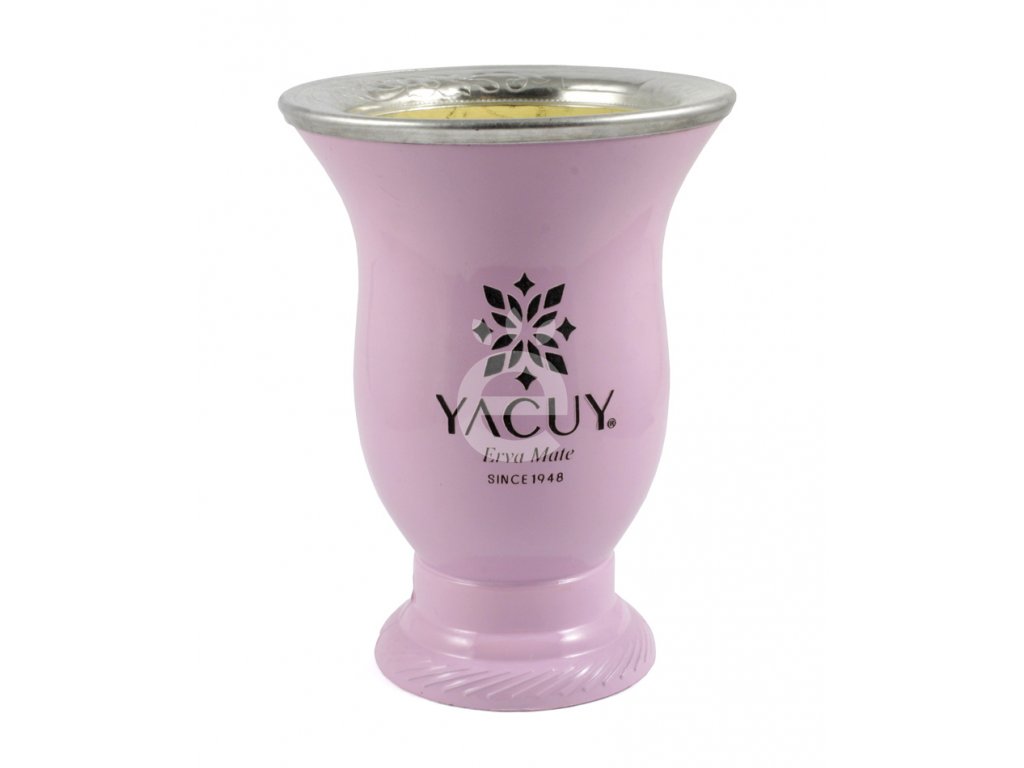 Originální porongo vyrobené z obráceného konce tykve, opláštěné umělohmotným obalem ve stříbrné metalíze a usazené v podstavci. Porongo je zdobené znakem firmy Yacuy. Horní okraj nádoby je oplechovaný s vytepaným ornamentem.