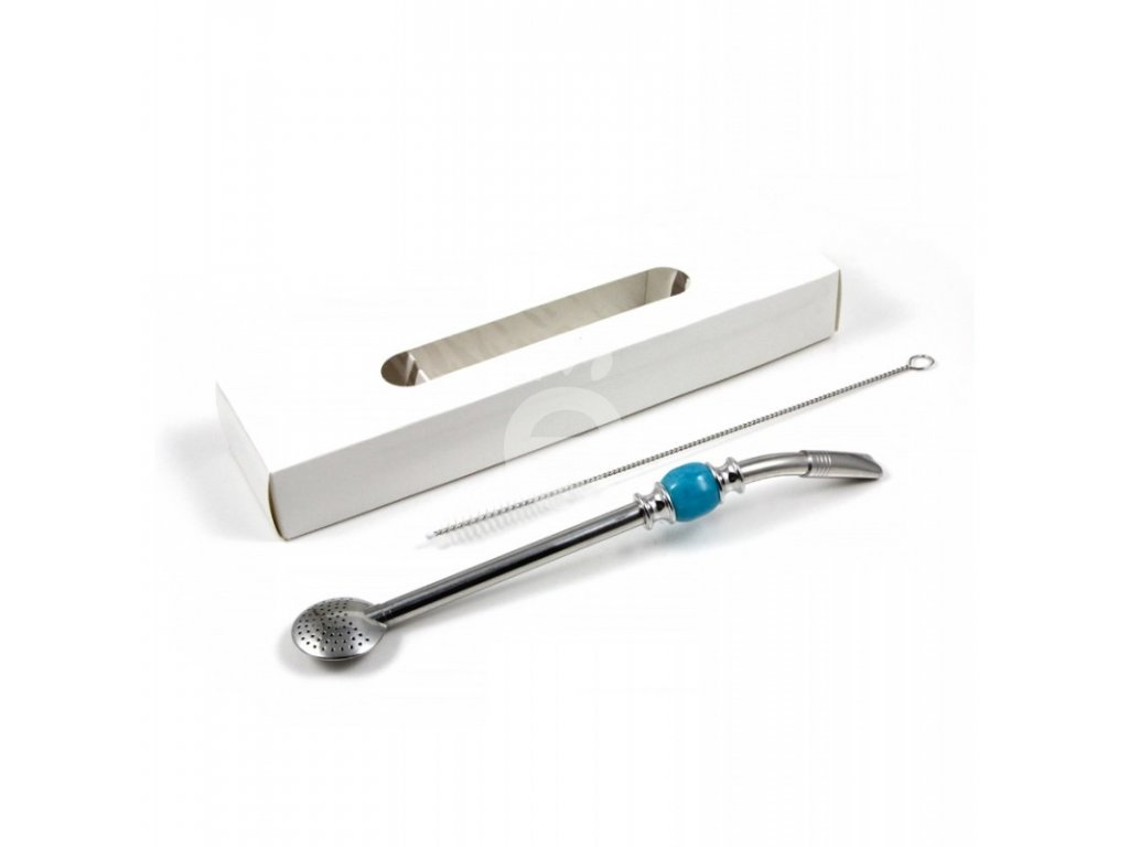 Bombilla s tyrkysově modrým kamenem o délce 21 cm z nerezové oceli + štěteček na čištění v krabičce.