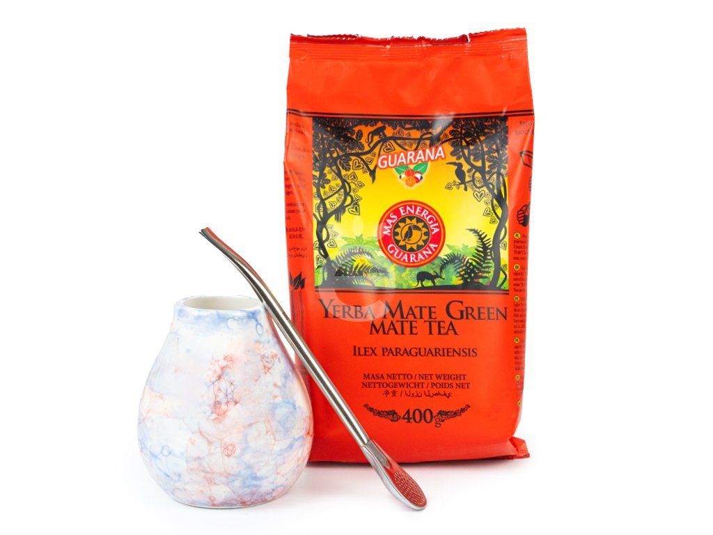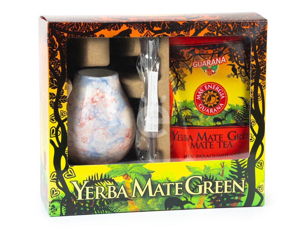 Set obsahuje Mate green Guarana 400 g, keramickou kalabasu a jednoduchou nerozebiratelnou bombillu.
