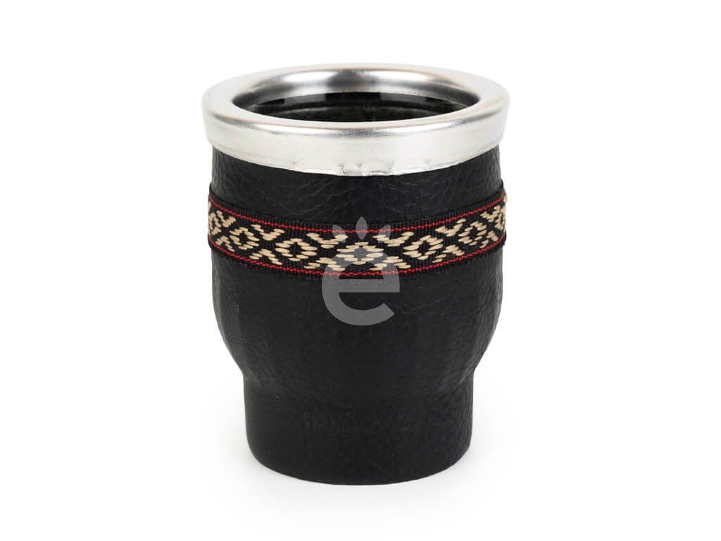 Skleněné matero potažené umělou kůží a zdobené páskem s ornamentem. Hrdlo je okováno nerezovou ocelí.