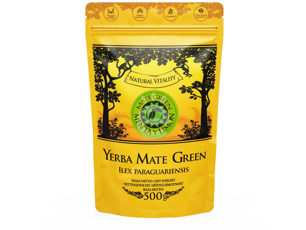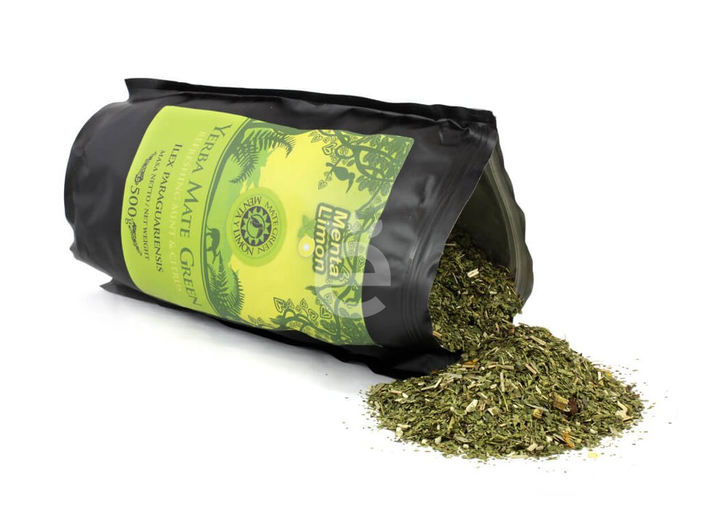 Složení: yerba mate (Ilex paraguariensis) 91 %, máta 3%, citronová tráva, kořen lékořice, šípky, měsíček, přírodní aroma